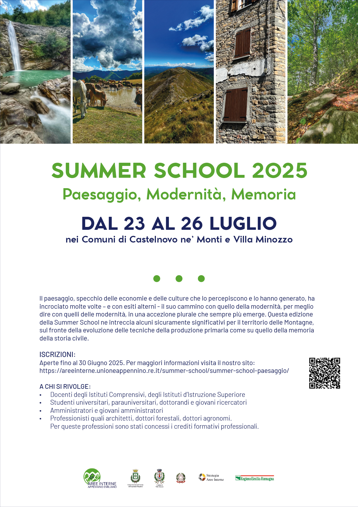 III edizione della summer school sul paesaggio, organizzata dall'Unione Montana dei Comuni dell'Appennino Reggiano e finanziata nell'ambito della Strategia Nazionale Aree Interne (programmazione 2014/20), che quest'anno affronterà i temi PAESAGGIO, MODERNITA' E MEMORIA.
