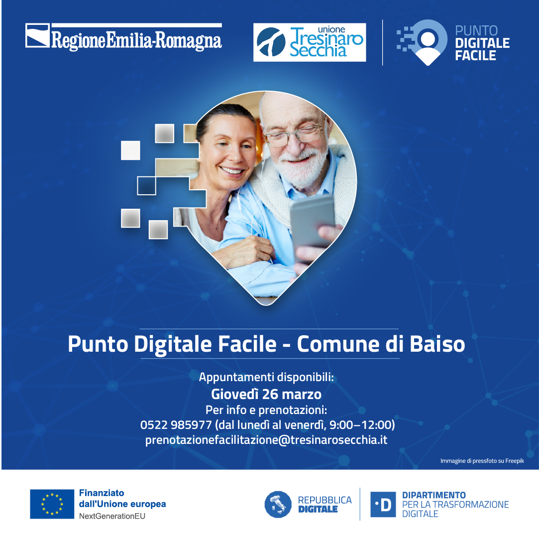 Il Punto Digitale Facile dell'Unione Tresinaro Secchia sarà disponibile per supportare i cittadini presso il Comune di Baiso (solo su appuntamento) il giorno giovedì 26 marzo 2026.